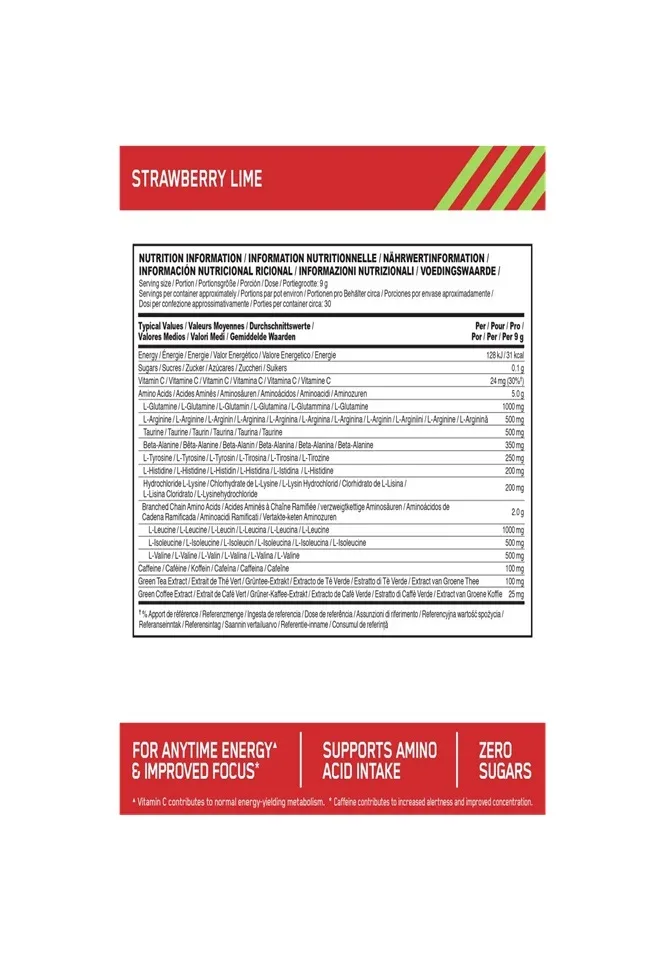 Energy + Muscle Recovery + Electrolytes Mix up Essential AMIN.O. Energy + Electrolytes anytime you want a boost of energy, muscle recovery and electrolyte support. Each serving provides 100 mg of caffeine from natural sources to support energy and focus along with 5 grams of amino acids for muscle recovery support—plus electrolytes to help replace what’s lost through sweat.¹ Strawberry Burst and Tangerine Wave now available in stick packs!